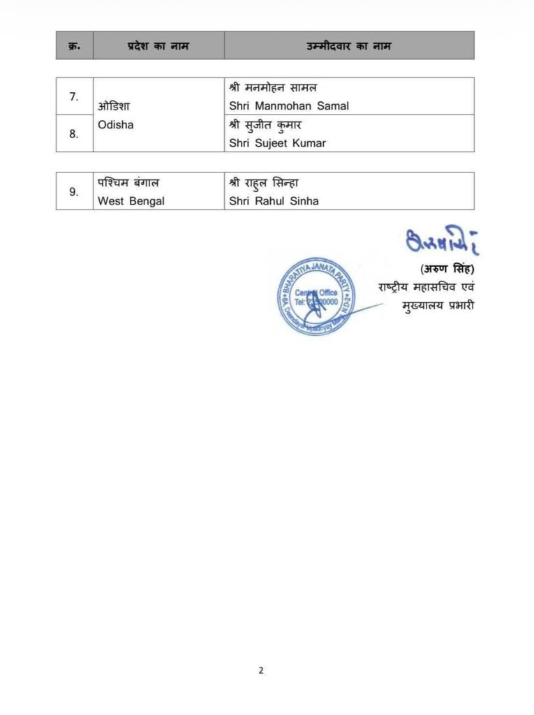 नई दिल्ली। भारतीय जनता पार्टी ने बिहार, छत्तीसगढ़, पश्चिम बंगाल, असम सहित कई राज्यों से राज्यसभा सीटों के लिए उम्मीदवारों की घोषणा कर दी है। बिहार से राष्ट्रीय अध्यक्ष नितिन नवीन और अगिआंव (भोजपुर) के पूर्व विधायक शिवेश राम को राज्यसभा का उम्मीदवार बनाया है। वहीं छत्तीसगढ़ से भारतीय जनता पार्टी की वरिष्ठ नेत्री श्रीमती लक्ष्मी वर्मा जी को राज्यसभा प्रत्याशी घोषित किया। देखें पूरी सूची।