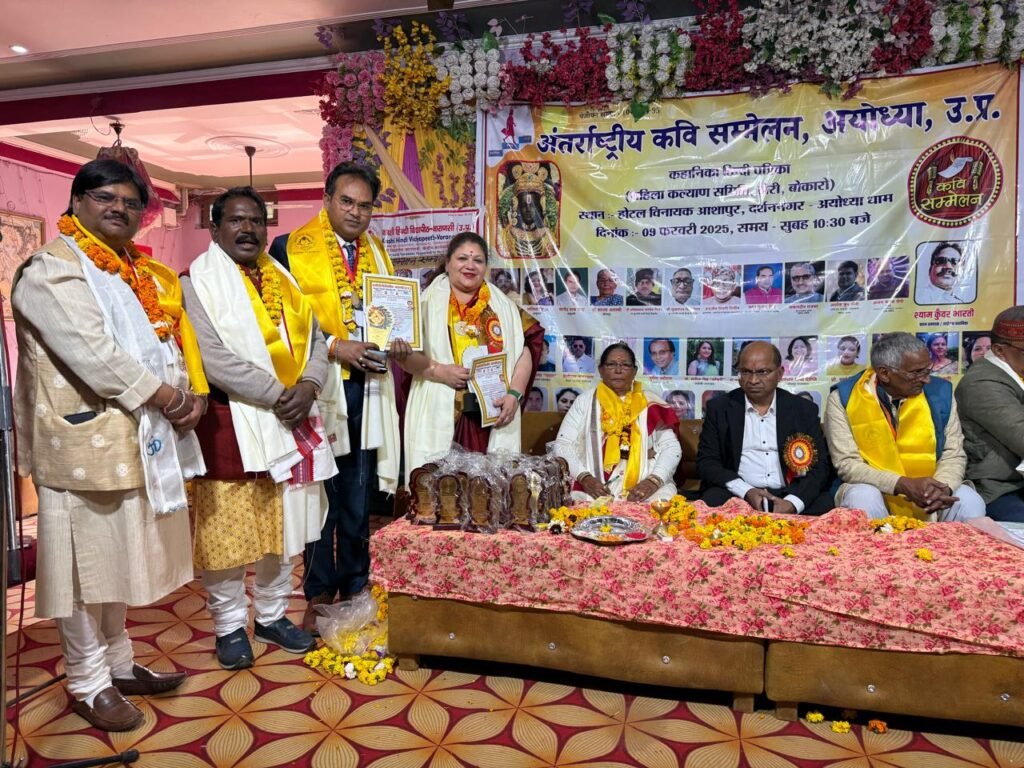 अयोध्याधाम। प्रभु श्रीराम की नगरी अयोध्या में 9 फरवरी को विनायक होटल अयोध्या धाम में कहानिका हिंदी पत्रिका द्वारा  महिला कल्याण समिति धोरी बोकारो द्वारा 9 फरवरी संचालित अंतरराष्ट्रीय कवि सम्मेलन सह विद्या वाचस्पति मानद सम्मान समारोह का आयोजन काशी हिंदी विद्यापीठ वाराणसी उत्तर प्रदेश के सहयोग से किया गया। जिसमें दुबई, आबुधाबी और देश के कई राज्यों उत्तर प्रदेश , मध्य प्रदेश,उत्तराखंड , राजस्थान बिहार और झारखंड से दर्जनों प्रतिष्ठित कवियों और कवयित्रियों ने भाग लिया और एक से बढ़कर काव्य पाठ किया।