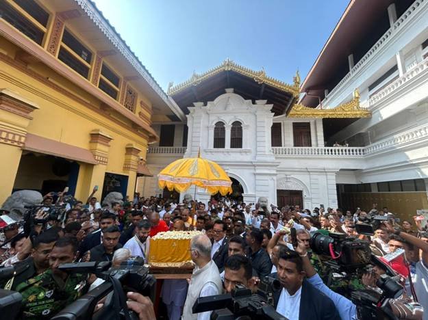 मध्य प्रदेश के राज्यपाल श्री मंगुभाई पटेल और अरुणाचल प्रदेश के उप मुख्यमंत्री श्री चोवना मीन के नेतृत्व में एक उच्च स्तरीय भारतीय प्रतिनिधिमंडल, वरिष्ठ बौद्ध भिक्षुओं और अधिकारियों के साथ, इन पवित्र अवशेषों को वापस ला रहा है, जिन्हें पहली बार अंतर्राष्ट्रीय प्रदर्शनी के लिए विदेश भेजा गया था। इस अवसर पर श्रीलंका के मंत्रियों और भारत के श्रीलंका में उच्चायुक्त की उपस्थिति में भंडारनायके अंतर्राष्ट्रीय हवाई अड्डे पर औपचारिक प्रस्थान समारोह आयोजित किया गया।